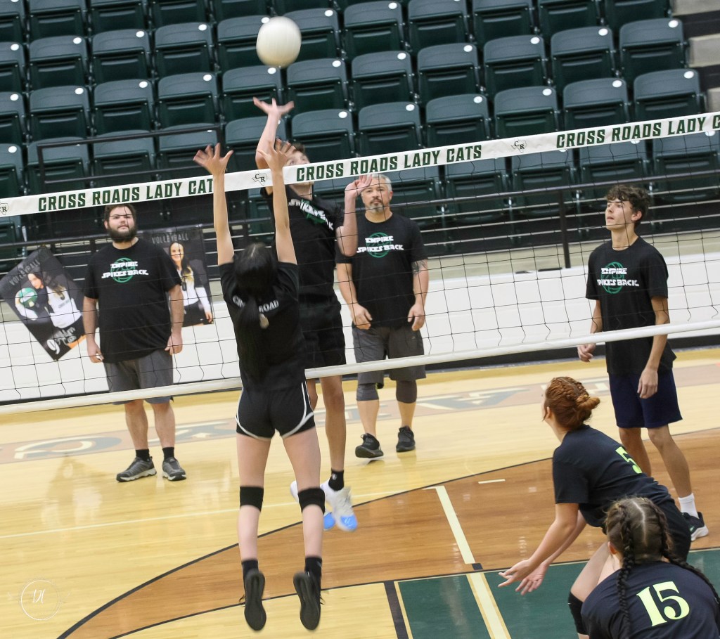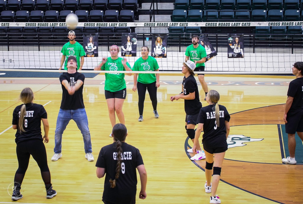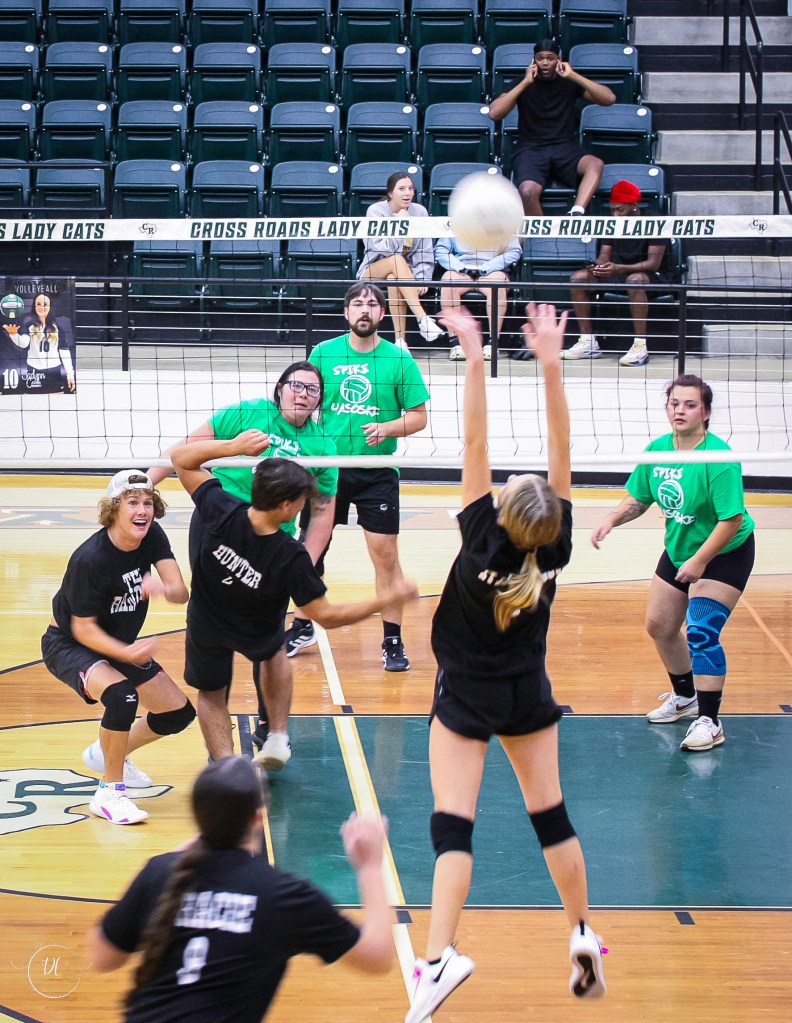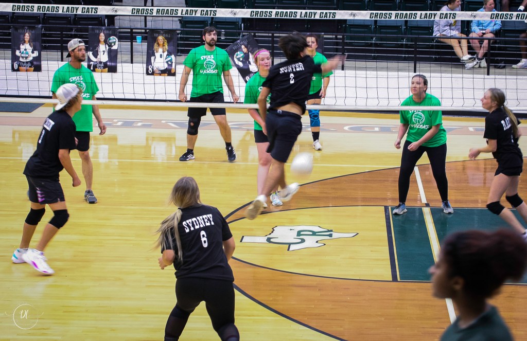 However, not to be underestimated, the group of adults who had once proudly worn the Cross Roads colors proved that age was just a number. Though a few years removed from their high school days, their experience and wisdom on the court shone brightly. Their strategic plays, combined with their uncanny ability to anticipate the opponent’s moves, earned them well-deserved applause and admiration from the crowd. The matches grew increasingly intense as the evening wore on, with each team giving their all to secure the coveted title. The high schoolers and the alumni battled fiercely, leaving no room for complaceny. The energy in the gym reached its peak as the final set approached, and the cheers from the spectators reverberated.