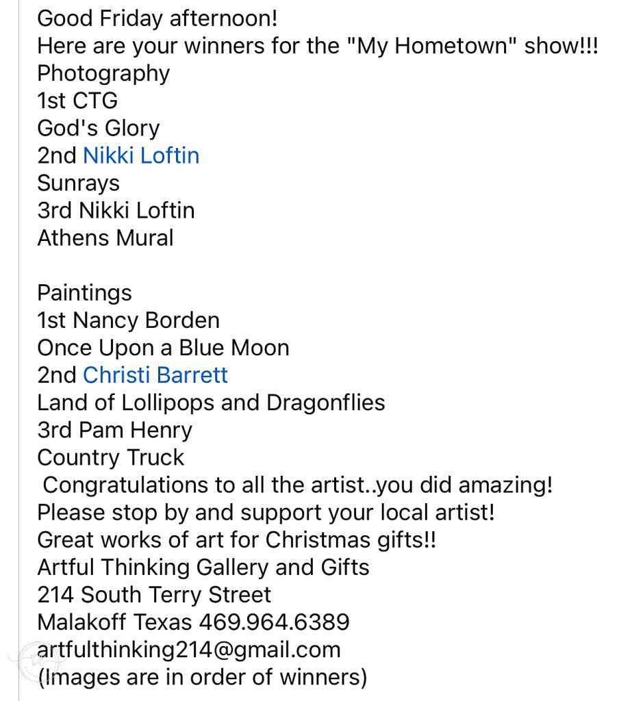 The My Hometown Art Show at Artful Thinking in Malakoff, Texas was a resounding success, showcasing the immense talent and creativity within our community. Winning 2nd and 3rd place in this esteemed event has been a personal triumph for me and I am incredibly grateful for this recognition. I believe this art exhibition serves as a reminder of the power of art to unite and inspire. I encourage everyone to continue to support local artists and events. Let us celebrate the beauty of our hometowns and foster a thriving artistic community that enriches our lives.