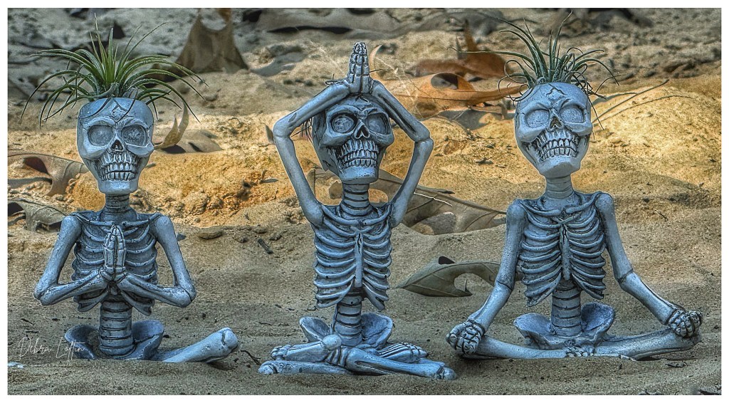 “Let’s meditate,” I suggested, mirroring the pose of my prayerful friend. Together, we closed our eye sockets and focused on the gentle rustle of leaves above us, the whispers of the wind weaving through the air. I could almost feel the spirit of nature surrounding us, reminding us that even in our skeletal forms, we were part of something greater. As I breathed in the air, I thought about the adventures that had led us here – how we had embraced our quirks and found joy in the absurdity of life. Each day was a new chapter, a new chance to explore the world around us.