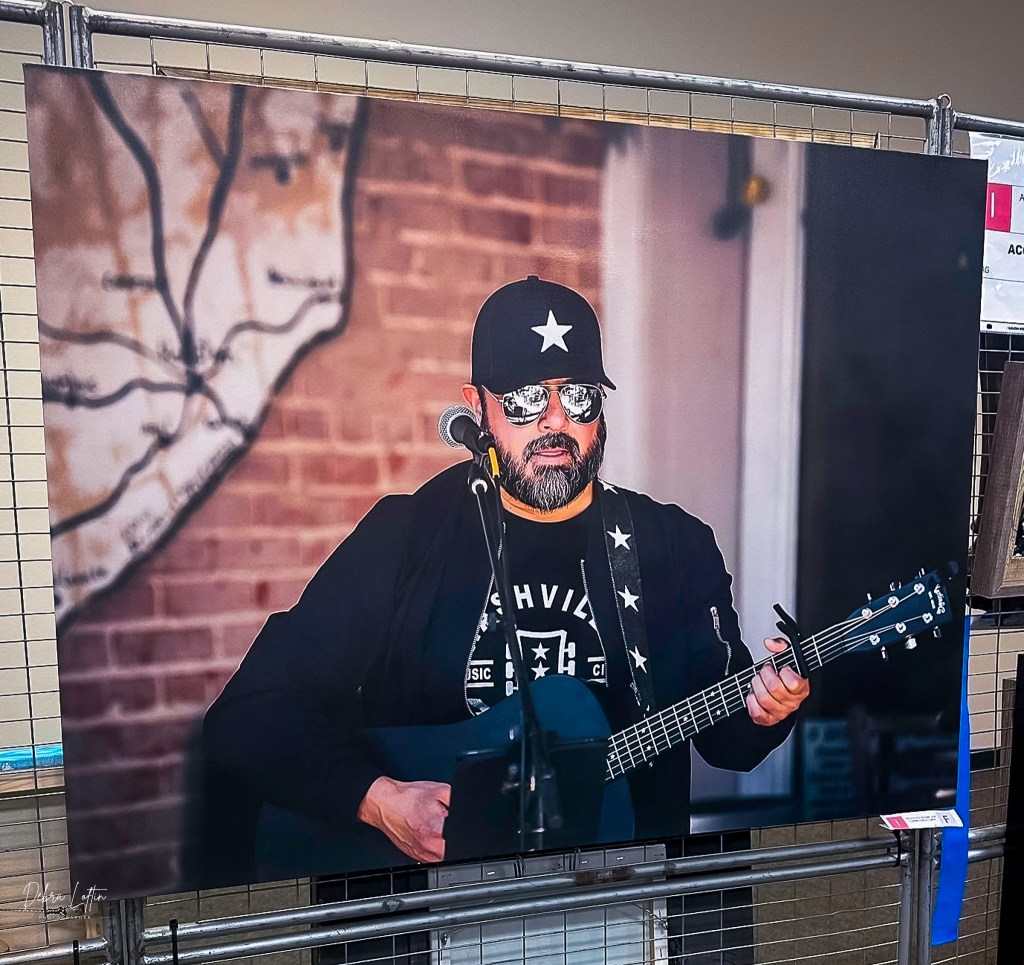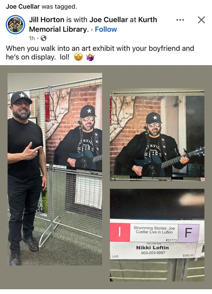 As the week went on, the show drew in art lovers, curious visitors, and even a few unexpected guests. Joe Cuellar himself walked into the library, with his girlfriend. He had no idea that I had entered a photo of him playing during the Art Walk. His expression was priceless – pure shock and delight as he stood there, staring at himself frozen in time on display. His girlfriend had posted it about the experience on her Facebook page with him tagged in it and I happened to see it and save the photo. It’s not everyday the photo you take is actually seen by the musician himself.