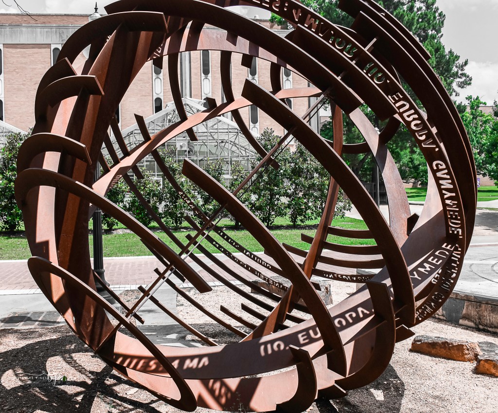 At first glance, this sculpture (found at Stephen F. Austin University in Nacogdoches, Texas) may seem like an industrial relic – its oxidized steel arcs coiling in calculated disorder. Look again. There is no chaos. This is celestial order, frozen mid-rotation, orbiting ideas instead of planets. The rings are not just cut metal, they are a modern echo of ancient armillary spheres, early tools used to map the stars and track the heavens. But here, rooted in the earth, it becomes something more: a portal between grounded rust and galactic dreams.