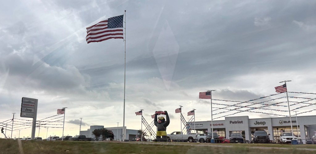 Flags lined the dealership like a row of proud guardians under a wild, windy sky. The clouds rolling heavy, the kind that make me want to pull over just to take it in. It reminds me how the most ordinary places can hold unexpected beauty.