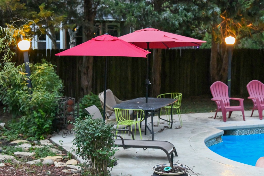Two red umbrellas and lime-green chairs surrounded a patio table by the pool, lit softly by vintage lamps. It felt like the kind of spot where laughter lingers long after the night ends.