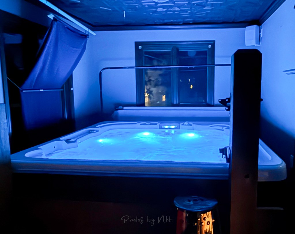 Inside the master bedroom, the hot tub was bathed in blue light that felt like a dream. The glow reflected on the walls and water, wrapping the space in a calm vibe. It was the perfect place to unwind and soak away the travel miles.