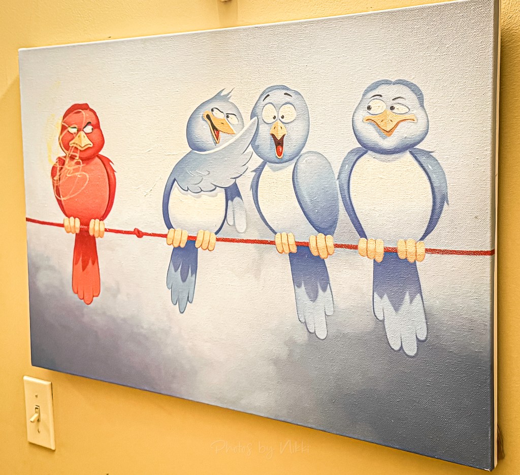 There was a but of humor hanging on the wall — a painting of quirky cartoon birds, each with their own expression. I found it to be playful, unexpected, and exactly what the house’s personality felt like – fun, real, and unpredictable.
