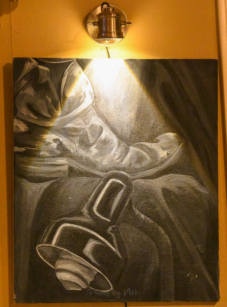 A black-and-white painting hung under a warm spotlight — a moody, introspective piece that spoke of thought and craftsmanship. Its soft light and deep tones contrasted perfectly with the golden walls.