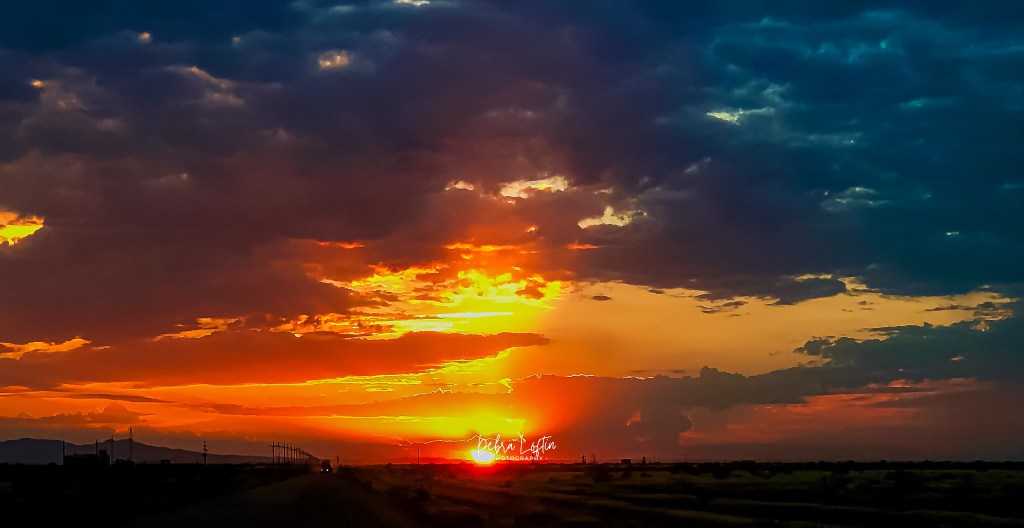 A desert sunset so fiery it could have fried an egg mid-air. The clouds layered themselves like a cosmic lasagna — dark on top, bright in the middle, spicy underneath. I took the photo and whispered, “Wow,” like it could hear me.