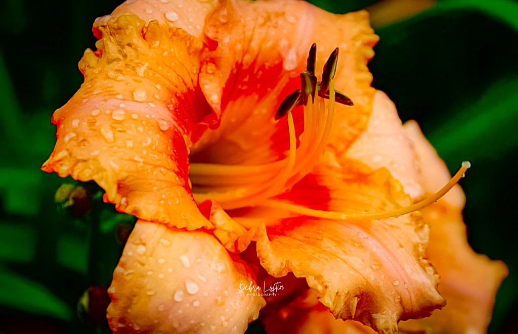 a daylily so dramatic it could have starred in its own soap opera. Still soaking wet from the morning rain, it looked like it had just finished crying in the bathroom at a family reunion — but in a glamorous way. Those ruffled petals practically saying, “Take my picture before I wilt, honey.”