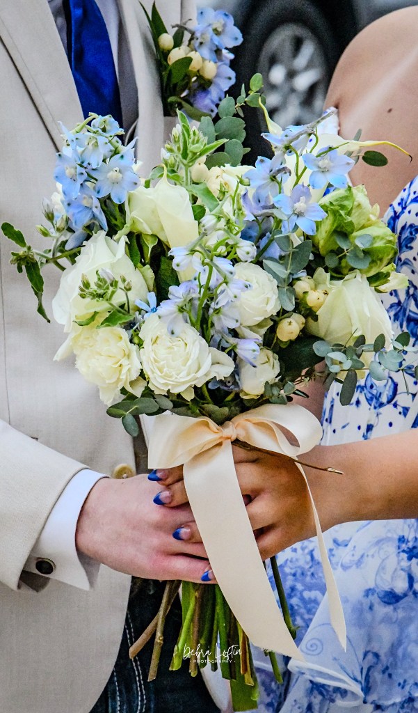 Before the laughter, before the spins, before the chaos of windblown hair – there are the details. The bouquet. Soft whites, pale blues, touches of green. The kind of arrangement that doesn’t scream for attention but quietly completes everything. Her nails matched the tone, his boutonnière tied together. These are the things that often get overlooked, but they are part of the memory just as much as the faces.